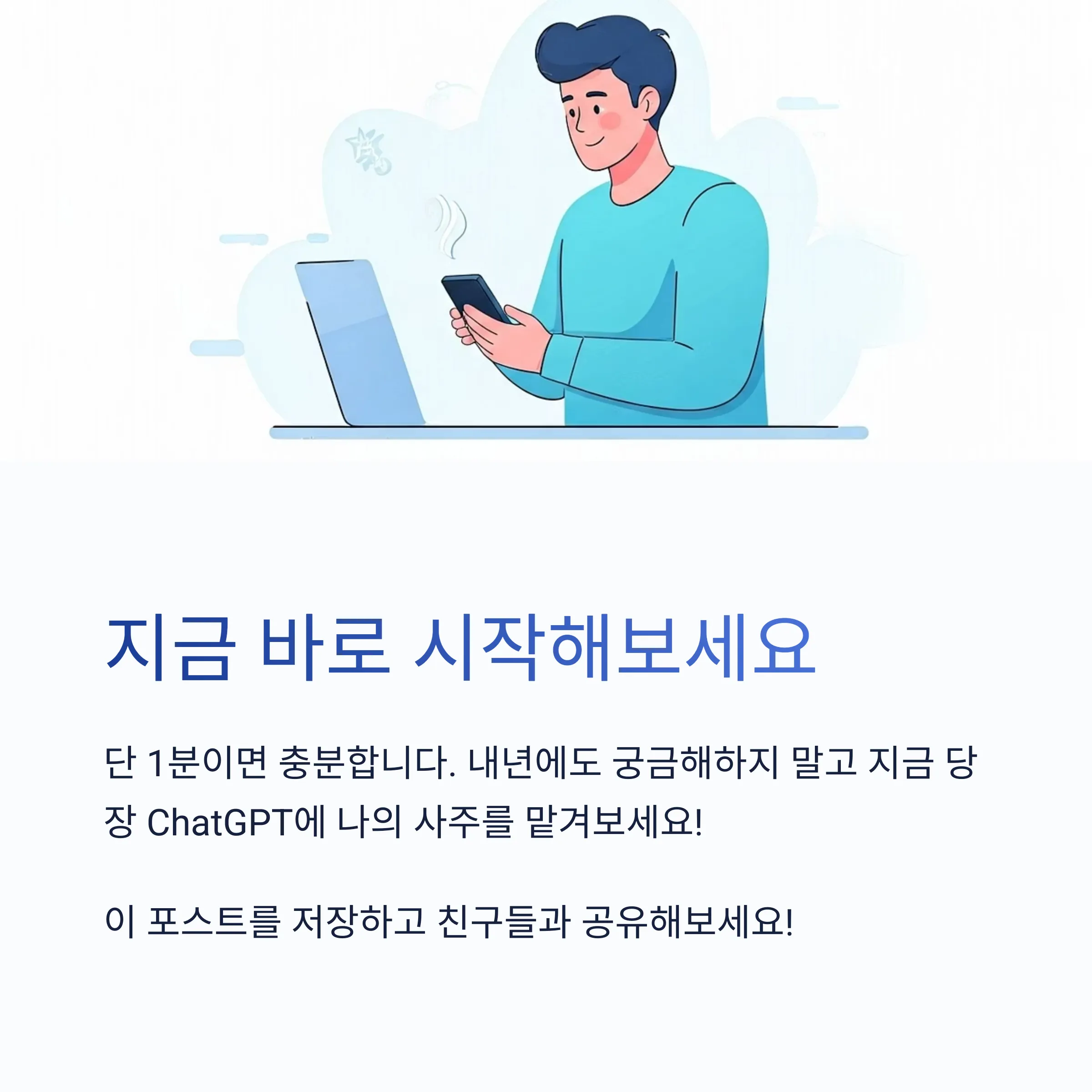 지금 당장 해보지 않으면, 내년에도 궁금해하면서 또 넘어갈지도 몰라요. 단 1분이면 충분하니까, 지금 바로 ChatGPT에 나의 사주를 맡겨보세요.